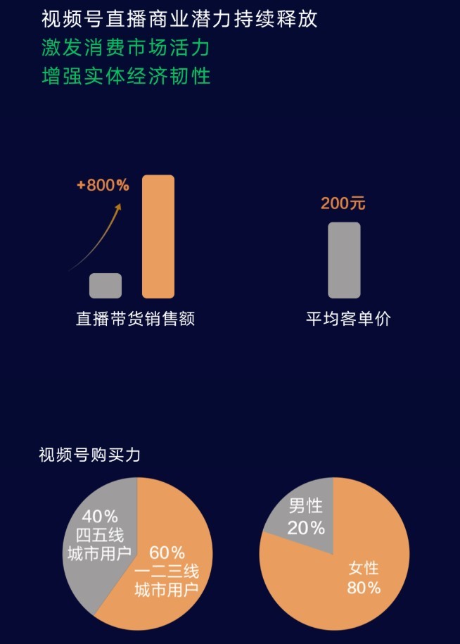 直播商业方面,2022年微信视频号直播带货销售额增长800%,平均客单价200元;购买力上,一二三线城市用户达60%,四五线城市占40%;女性占比80%,男性占比20%。