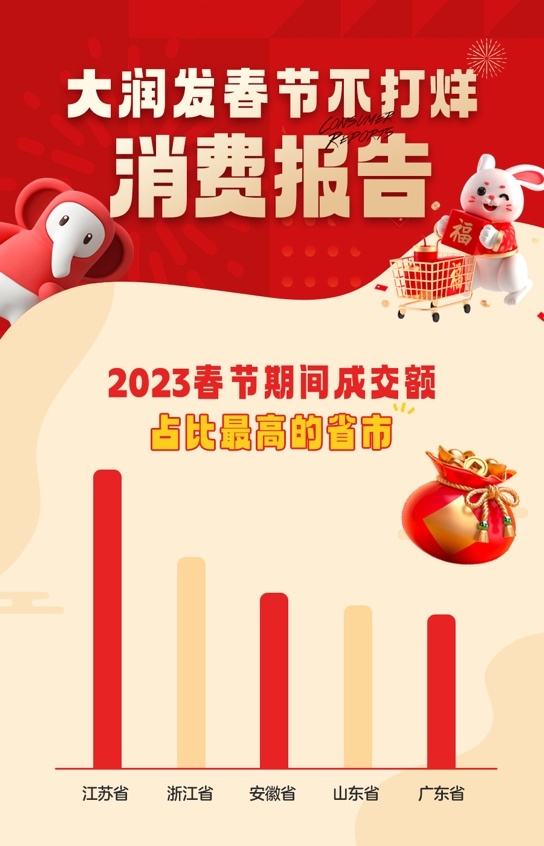 值得关注的是,根据大润发春节消费数据:今年初一到初五,大润发客单价同比增长6.1%。消费者在大润发买得最多的是三大品类是白酒、常温奶和糕点。2023春节期间成交额占比最高的省是江苏省、浙江省、安徽省、山东省和广东省;城市方面,苏州市、上海市、南通市、无锡市、宁波市业绩领跑全国。