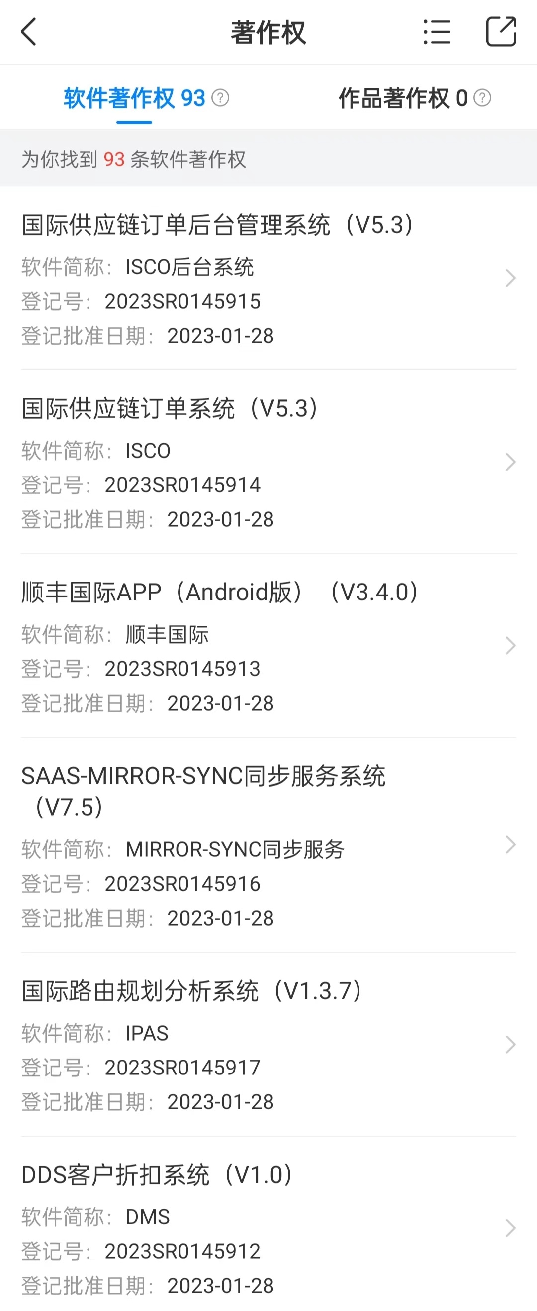 1月29日消息,天眼查信息显示,日前,深圳市顺丰投资有限公司“顺丰国际APP(Android版)”“国际供应链订单后台管理系统”“国际供应链订单系统”、“DDS客户折扣系统”、“国际路由规划分析系统”、“SAAS-MIRROR-SYNC同步服务系统”软件著作权获得登记批准,软件简称分别为“顺丰国际”、“ISCO后台系统”、“ISCO”、“DMS”、“IPAS”、“MIRROR-SYNC同步服务”。