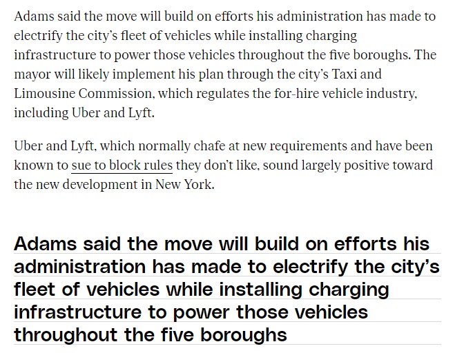 同时,亚当斯表示纽约市居民应该尝试驾驶电动汽车,并计划通过在所有五个行政区建立更多电动汽车充电基础设施,以支撑更多电动汽车使用。市长可能会通过市出租车和豪华轿车委员会来实施他的计划,该委员会负责监管包括Uber和Lyft在内的出租汽车行业。