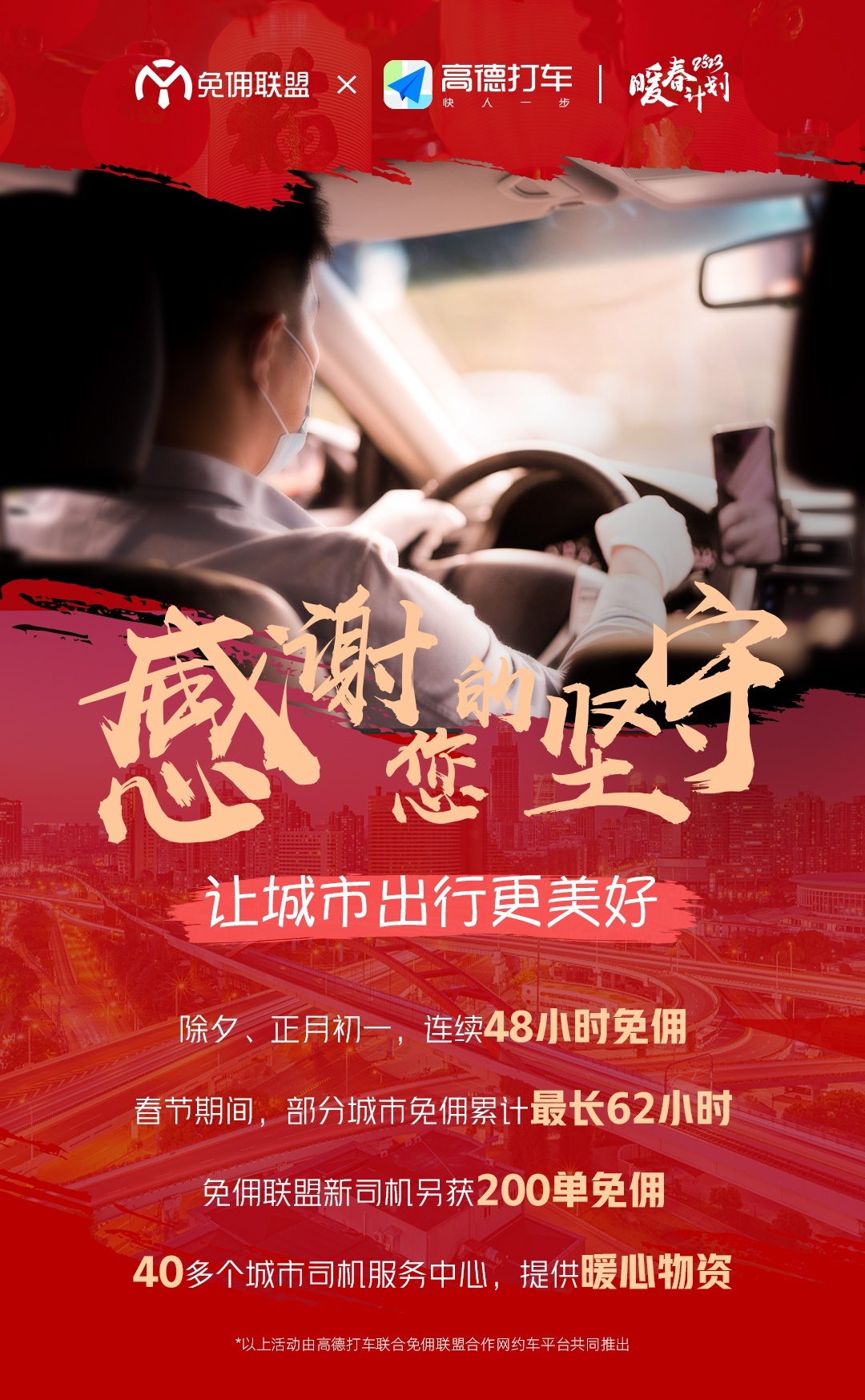 值得一提的是,春节期间,为保障假期市民出行,鼓励和感谢司机坚守岗位,高德打车联合免佣联盟合作网约车平台加码“暖春计划”,为留守司机加大免佣力度,除夕、正月初一连续48小时为司机免佣。