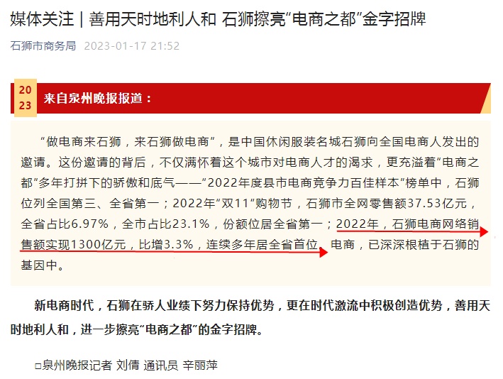 值得关注的是,近年来,泉州市持续深入实施“一十百千万”网红城市发展计划,谋划布局各类精选电商、生态电商、社交电商等细分领域中小电商平台。“2022年度县市电商竞争力百佳样本”榜单中,石狮位列全国第三、全省第一;2022年,石狮电商网络销售额实现1300亿元,比增3.3%,连续多年居全省首位。