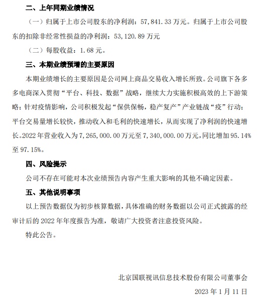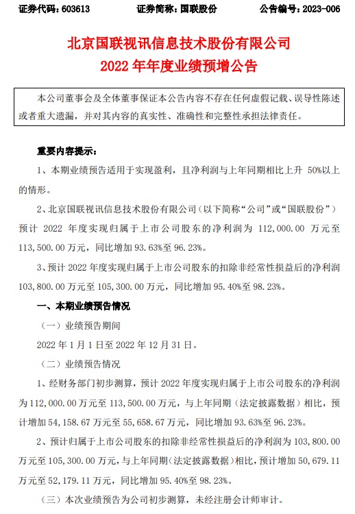 国联股份近日发布2022年年度业绩预增公告,预计2022年度实现归属于上市公司股东的净利润为112,000.00万元至113,500.00万元,与上年同期(法定披露数据)相比,预计增加54,158.67万元至55,658.67万元,同比增加93.63%至96.23%。