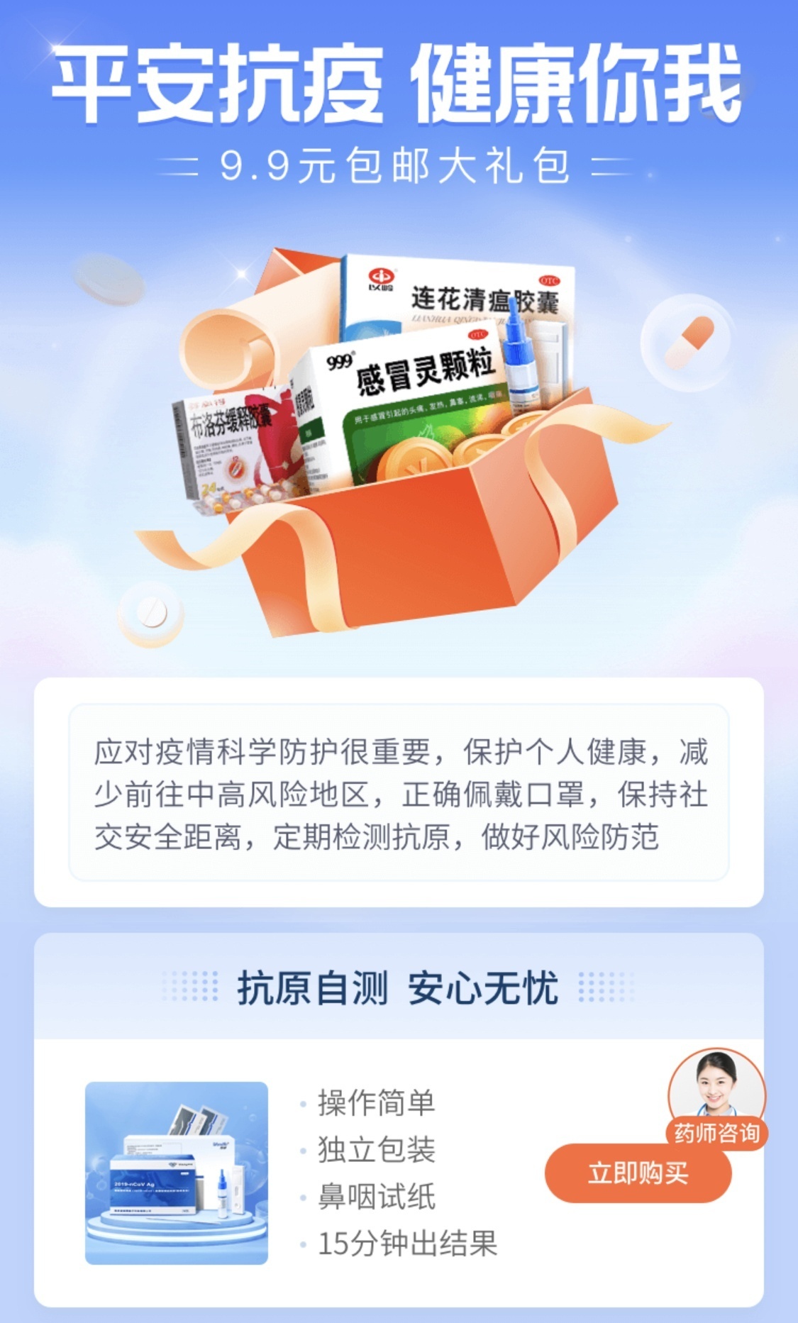 为缓解购药难题,平安健康还通过“新冠防护常备药品专区”为居民提供医用口罩、抗原自测试剂盒、免洗消毒凝胶、医用手套、防护服等防疫消杀物品,一键下单即可享受免费送药到家的服务。慢病患者也可通过“新冠防护常备药品专区”购买心脑血管、内分泌、神经系统等慢病相关药品,以防家中出现药品断档情况。