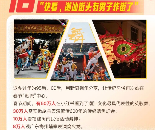 春节期间,有50万人在小红书看到了潮汕文化最具代表性的英歌舞;30万人赏安徽歙县表演流传600年的传统嬉鱼灯会;10万人看福建闽南民俗活动游神;8万人观广东梅州埔寨表演烧火龙。