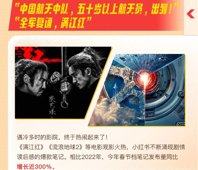 春节期间,《满江红》《流浪地球2》等电影观影火热,小红书不断涌现剧情读后感的爆款笔记。相比2022年,今年春节档笔记发布量同比增长近300%。