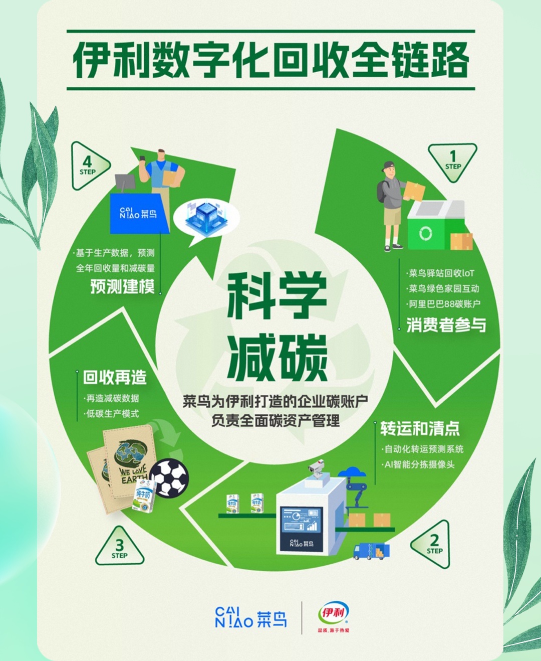 2022年,菜鸟与伊利合作开发了“全链路减碳数字化系统”,可记录商品在仓储、运输、驿站和消费者端的减碳数据,数字化衡量商品的碳排放表现,并提供各类优化碳排放量建议。在与消费者绿色互动上,覆盖全国300多个城市的超8万家菜鸟驿站和互动社区“菜鸟绿色家园”为伊利亿万消费者提供了线下线上可参与的绿色回收主阵地。