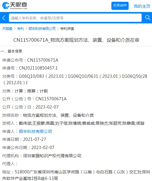 专利信息显示,同日,该公司还申请公布一项“物流方案规划方法、装置、设备和介质”专利,申请公布号CN115700671A,申请日期为2021年7月27日。