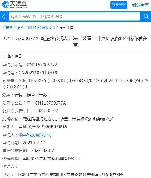 2月7日消息,顺丰科技有限公司今日申请公布一项“配送路径规划方法、装置、计算机设备和存储介质”专利,申请公布号CN115700677A,申请日期为2021年7月14日。