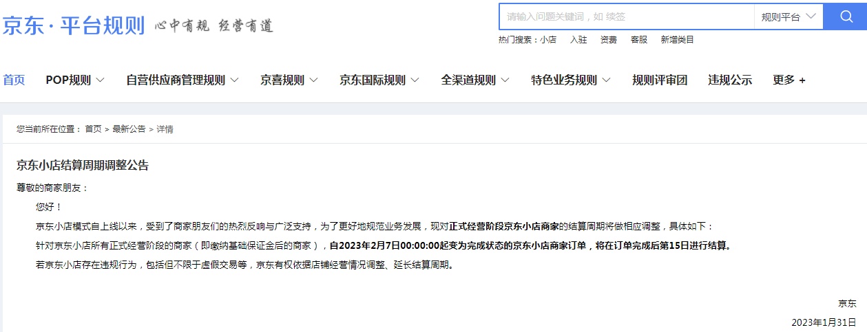 与此同时,京东还发布京东小店结算周期调整公告,为了更好地规范业务发展,现对正式经营阶段京东小店商家的结算周期做相应调整。