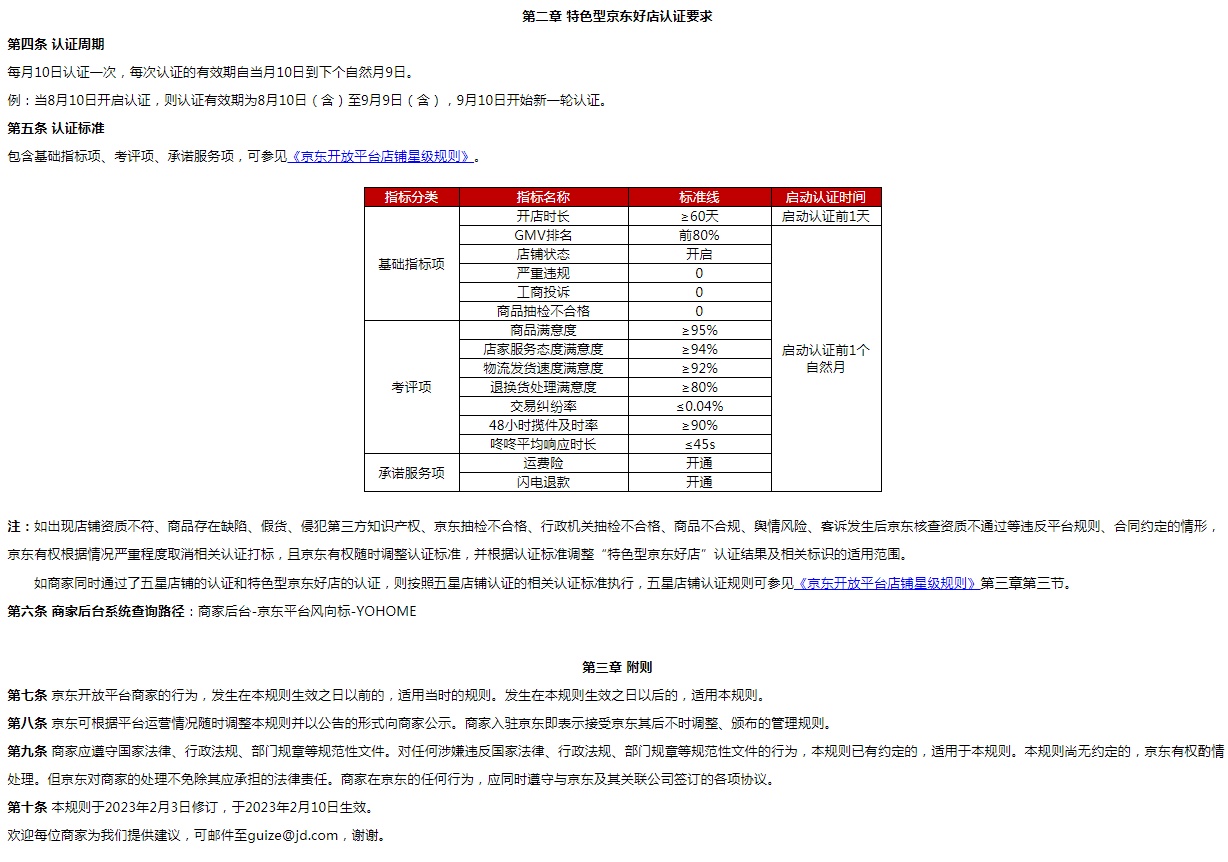 如商家同时通过了五星店铺的认证和特色型京东好店的认证,则按照五星店铺认证的相关认证标准执行,五星店铺认证规则可参见《京东开放平台店铺星级规则》第三章第三节。