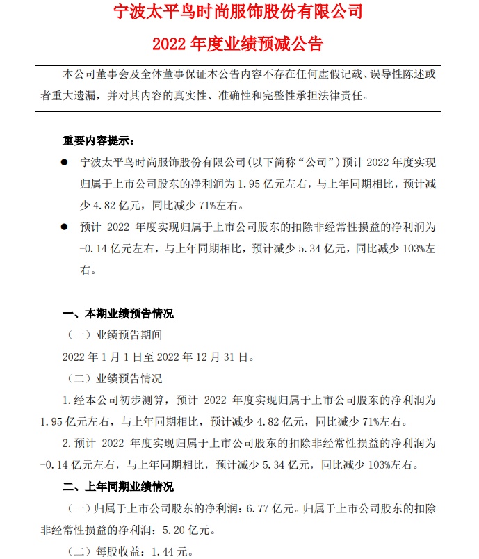 不久前,太平鸟发布2022年度业绩预减公告。业绩预告期间为2022年1月1日至2022年12月31日。