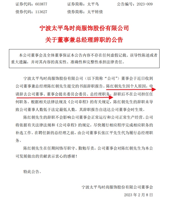 2月7日消息,宁波太平鸟时尚服饰股份有限公司(以下简称“太平鸟”或“公司”)发布关于董事兼总经理辞职的公告。