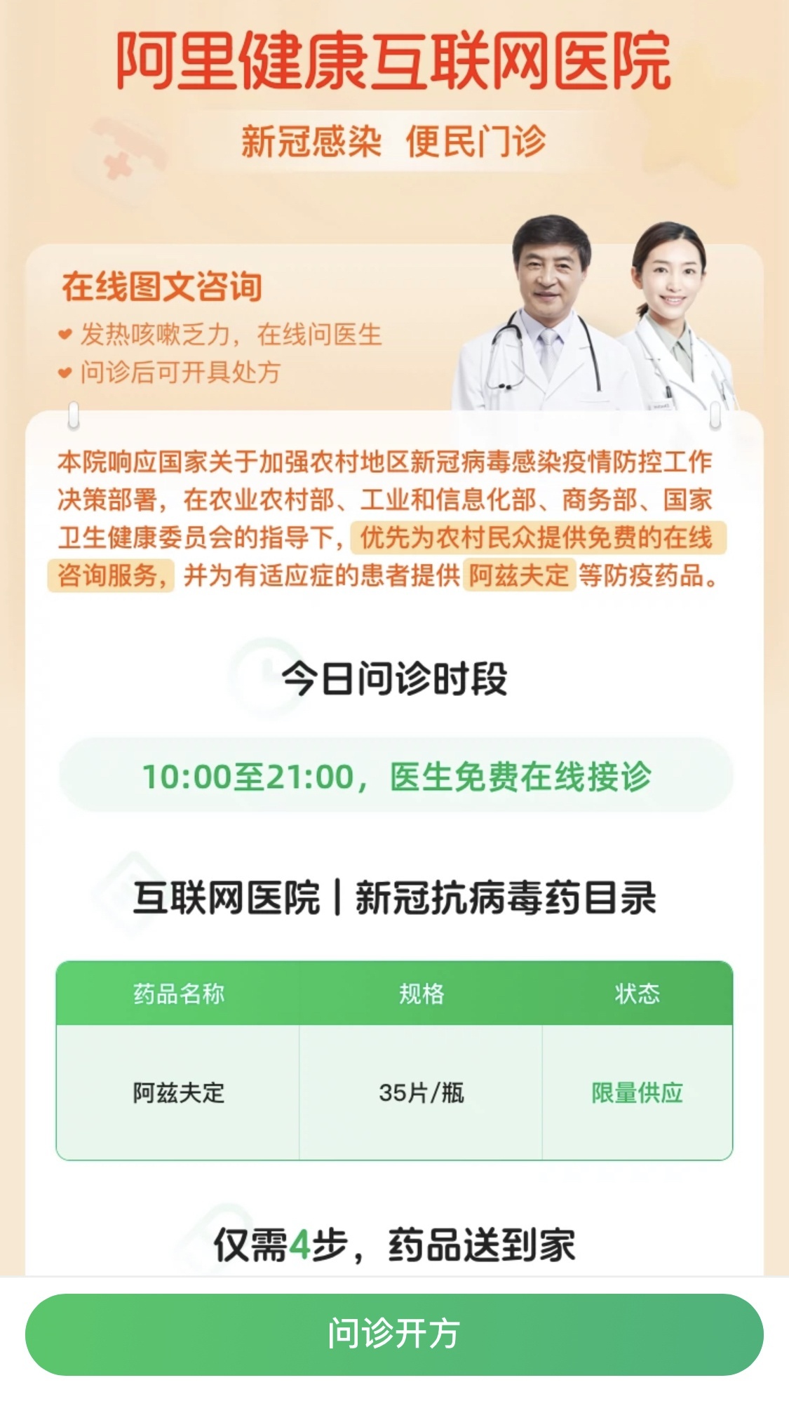 阿里健康互联网医院目前在每天10点至21点提供新冠在线义诊和新冠药品阿兹夫定的问诊开方服务。来自农村地区的用户买到所需药品需要四步:首先在线填写预诊单,然后与医生详细沟通病情,经医生酌情开具处方后,就可以在线支付购药,等待药品配送到家。