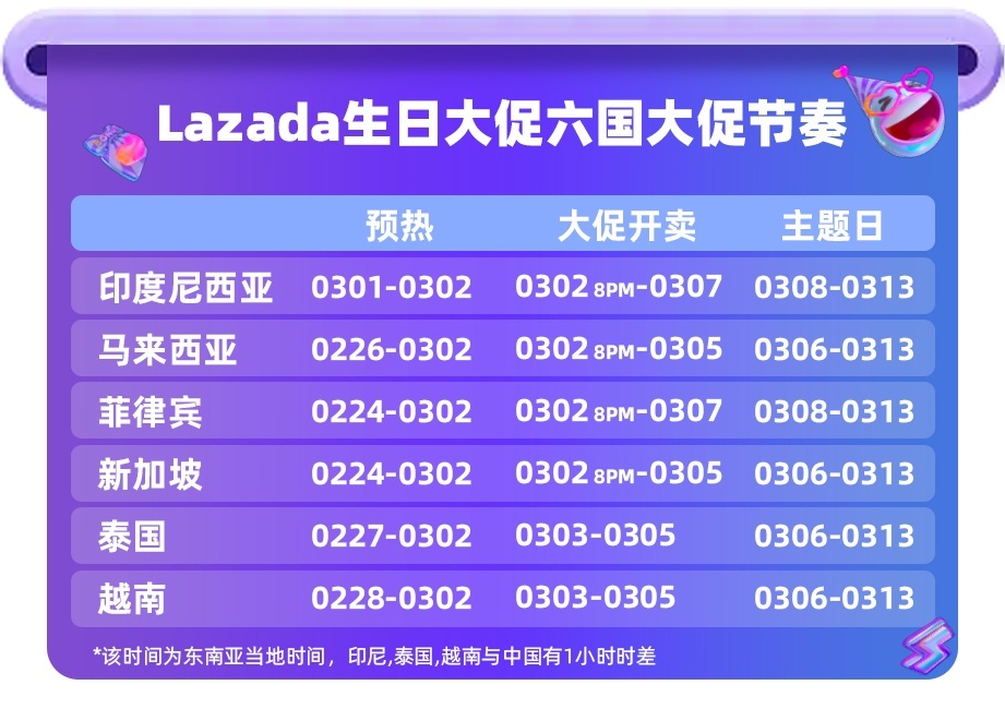 值得一提的是,今年是Lazada成立11周年,在印尼、马来、菲律宾及新加坡,今年Lazada生日大促将提前至3月2日晚8点(当地时间)开启;在泰国和越南,大促将从3月3日凌晨0点开始(当地时间),但生日大促LazExtra Flash促销会在3月2日晚8点开卖。