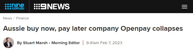 2月7日消息,据媒体报道,提供先买后付服务(BNPL)的澳洲金融科技公司Openpay已进入接管程序,成为首家提供BNPL服务、在澳洲上市的倒闭公司。周一(2月6日),这家位于墨尔本的BNPL供应商向澳大利亚证券交易所(ASX)宣布,它已经进入了破产管理程序。