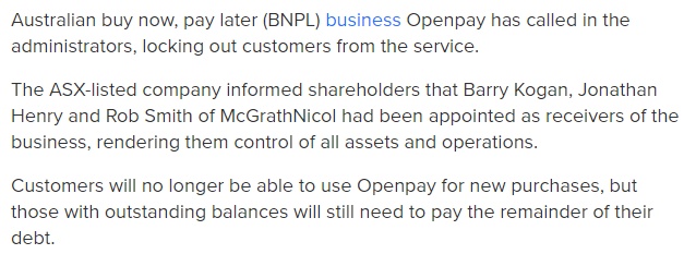 澳洲先买后付公司Openpay破产