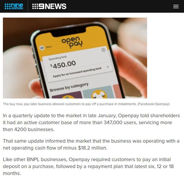 在1月底的市场季度更新中,Openpay告诉股东,它拥有超过347,000名用户的活跃客户群,为4200多家企业提供服务,但同时表示其净运营现金流为-1820万美元。