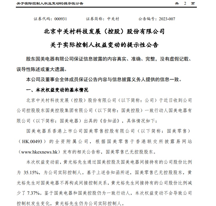 值得关注的是,2月3日晚,中关村发布了一则关于实际控制人权益变动的提示性公告。