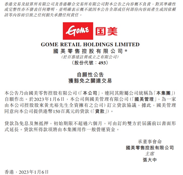 此前,黄光裕旗下公司分别于去年12月8日、12月14日、12月22日、12月30日先后向国美零售提供了1.5亿港元、2亿港元、1.5亿港元、1.3亿港元的免息、无抵押贷款,若算上本次的1.5亿港元,国美零售已获黄光裕“输血”合计7.8亿港元。