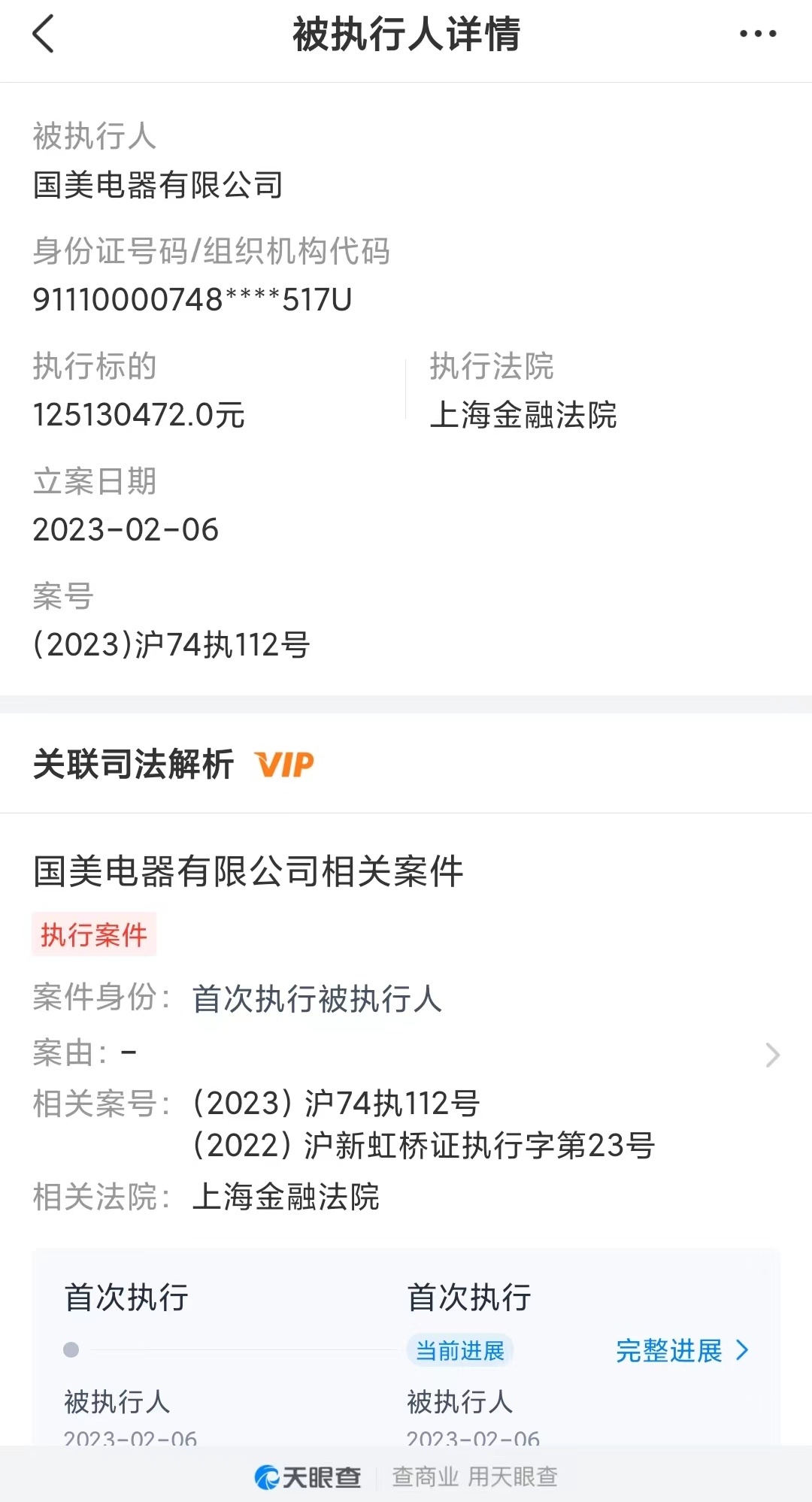 2月7日消息,天眼查App显示,近日,国美电器有限公司、永乐(中国)电器销售有限公司新增一则被执行人信息,执行标的1.25亿余元,执行法院为上海金融法院。