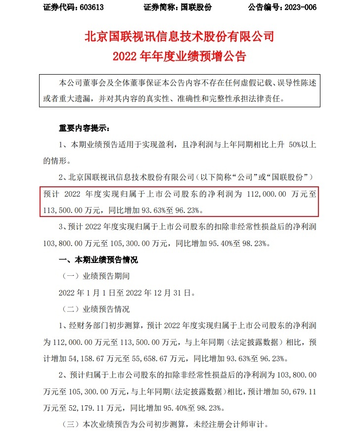值得一提的是,国联股份近日发布2022年年度业绩预增公告,经财务部门初步测算,公司预计2022年度(2022年1月1日至2022年12月31日)实现归属于上市公司股东的净利润为11.2亿元至11.35亿元,与上年同期(法定披露数据)相比,预计增加5.42亿元至5.57亿元,同比增加93.63%至96.23%。