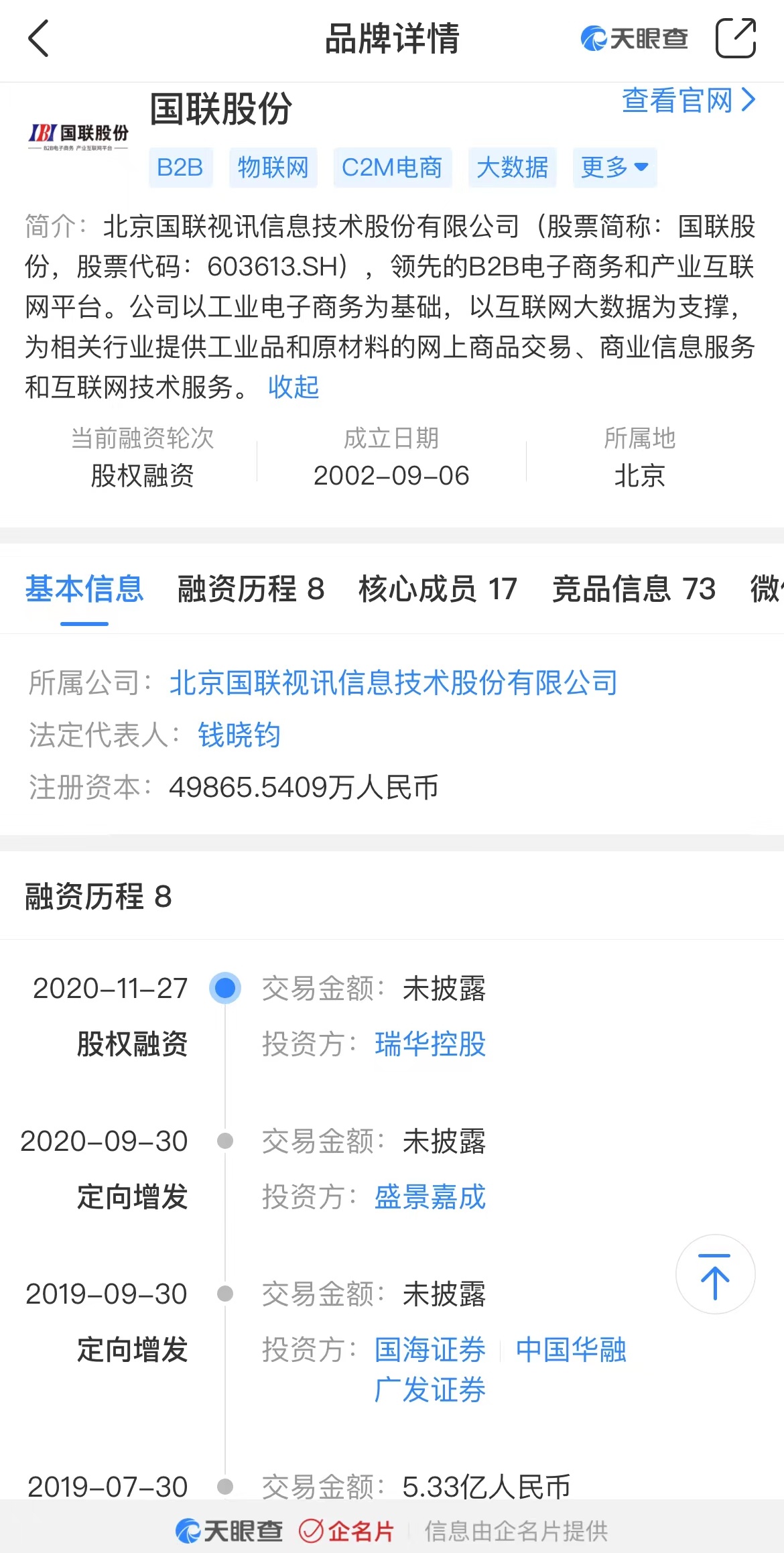 天眼查资料显示,国联股份是领先的B2B电子商务和产业互联网平台。公司以工业电子商务为基础,以互联网大数据为支撑,为相关行业提供工业品和原材料的网上商品交易、商业信息服务和互联网技术服务。