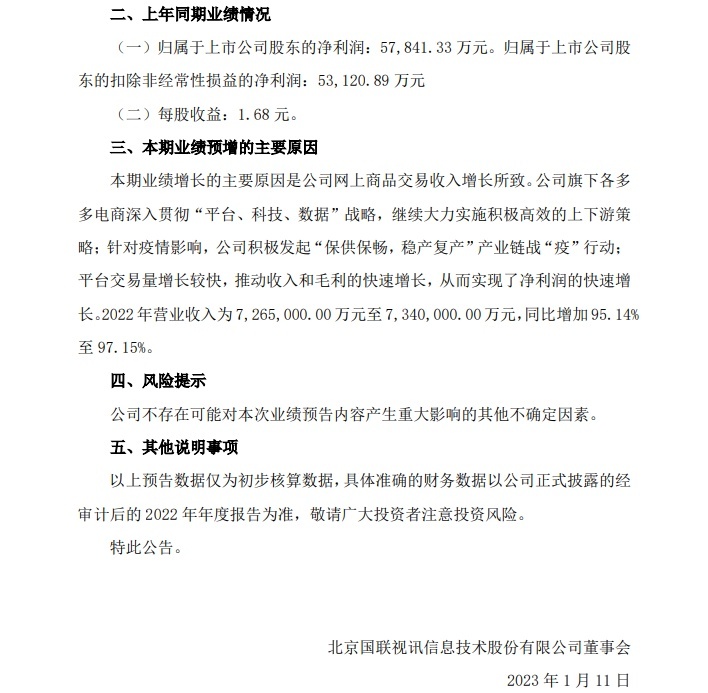 国联股份表示,本期业绩增长的主要原因是公司网上商品交易收入增长所致。公司旗下各多多电商深入贯彻“平台、科技、数据”战略,继续大力实施积极高效的上下游策略;平台交易量增长较快,推动收入和毛利的快速增长,从而实现了净利润的快速增长。2022年营业收入为726.5亿元至734亿元,同比增加95.14%至97.15%。