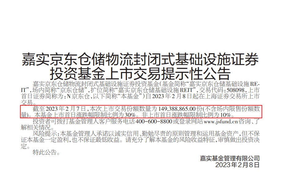 嘉实京东仓储物流封闭式基础设施证券投资基金上市交易提示性公告显示,截至2023年2月7日,本次上市交易份额数量为149,388,865.00份(不含场内限售份额数量)。本基金上市首日涨跌幅限制比例为30%。非上市首日涨跌幅限制比例为10%。