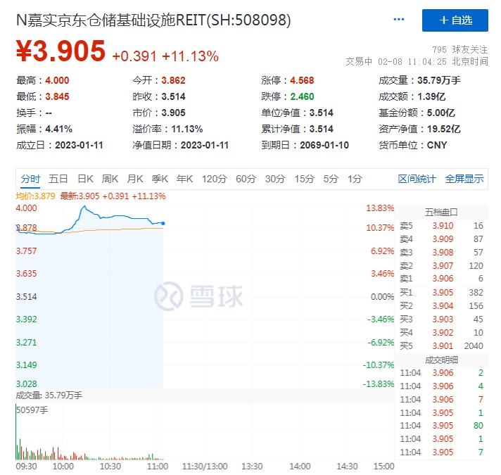 2月8日消息,嘉实京东仓储物流封闭式基础设施证券投资基金今日正式在上海证券交易所上市,成为首只民企仓储物流REIT。截至发稿,该REIT每份额报价3.905元,较发行价涨幅超11%。