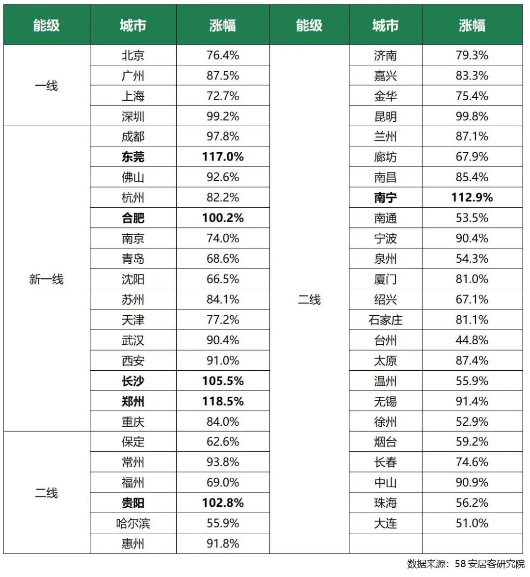 从城市来看,所有监测城市新春开工一周(1.28-2.3)较春节假期(1.21-1.27)找房热度均有所上涨,其中新一线城市中东莞、长沙、合肥、郑州及二线城市贵阳、南宁,涨幅较大,均上涨超100%。