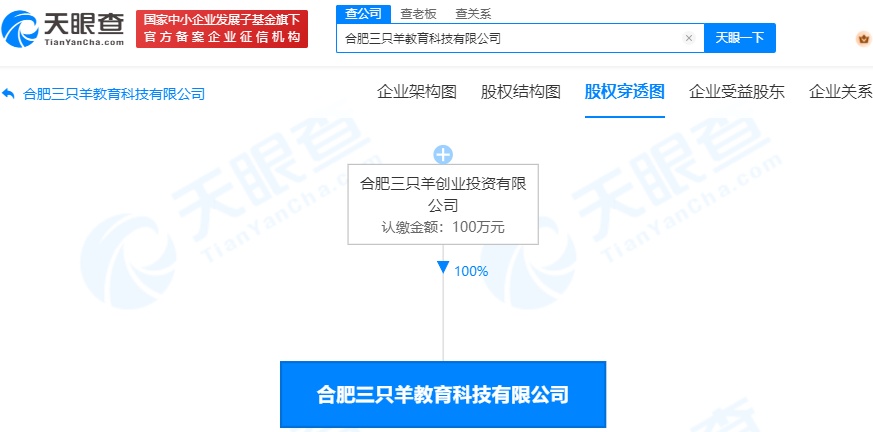 股东信息显示,合肥三只羊教育科技有限公司公司由“疯狂小杨哥”关联公司合肥三只羊创业投资有限公司全资持股。