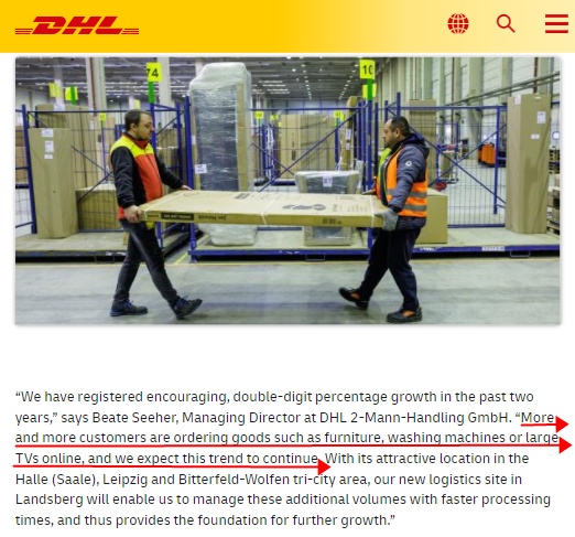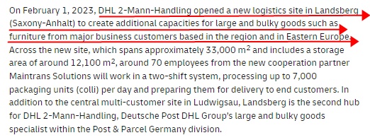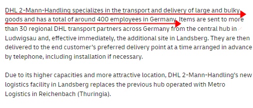 据介绍,DHL 2-Mann-Handling专门从事大型和笨重货物的运输及交付,在德国有约400名员工。物品从路德维希堡的中心枢纽和兰茨贝格的额外站点发送到德国各地的30多个区域DHL运输合作伙伴。然后,在事先通过电话安排的时间(包括必要时的安装)将其交付至最终客户的首选交付点。