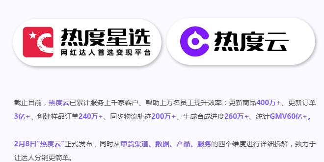 2022年,“热度星选”完成对抖快头部工具服务商“超盘云”的战略并购,并将“超盘云”品牌正式升级为“热度云”。“热度云”是业内首创的抖音/快手达人分销一站式管理工具,通过达人CRM、多平台商品库、业绩自动计算、小程序货盘表、样品跟踪监测等方案,大幅提升品牌在达人分销领域的经营效率。