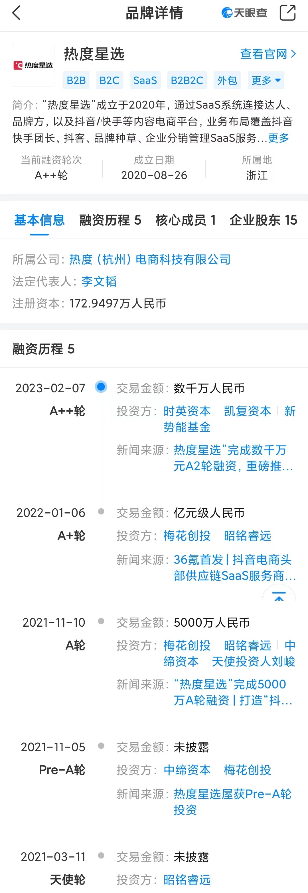 信息显示,“热度星选”成立于2020年,通过SaaS系统连接达人、品牌方,以及抖音快手等内容电商平台,业务布局覆盖抖音快手团长、抖客、品牌种草、企业分销管理SaaS服务等板块。为商家提供“爆品打造”、“纯佣带货”的商品分发交付服务,并为KOL提供“爆款商品”及“高效选品”等精细化运营服务。
