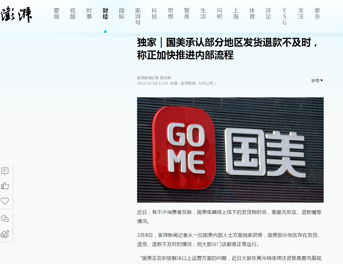 国美承认部分地区发货退款不及时 称正加快推进内部流程