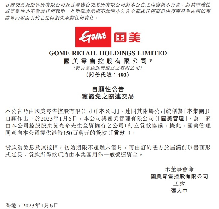 此外,为偿还集团债务,节约现金资源,国美零售近期已多次开启债务资本化。为缓解运营压力,黄光裕还向国美零售多次贷“输血”,用作集团一般营运资金。2022年12月至2023年1月期间累计向国美零售输血7.8亿港元免息无抵押贷款。