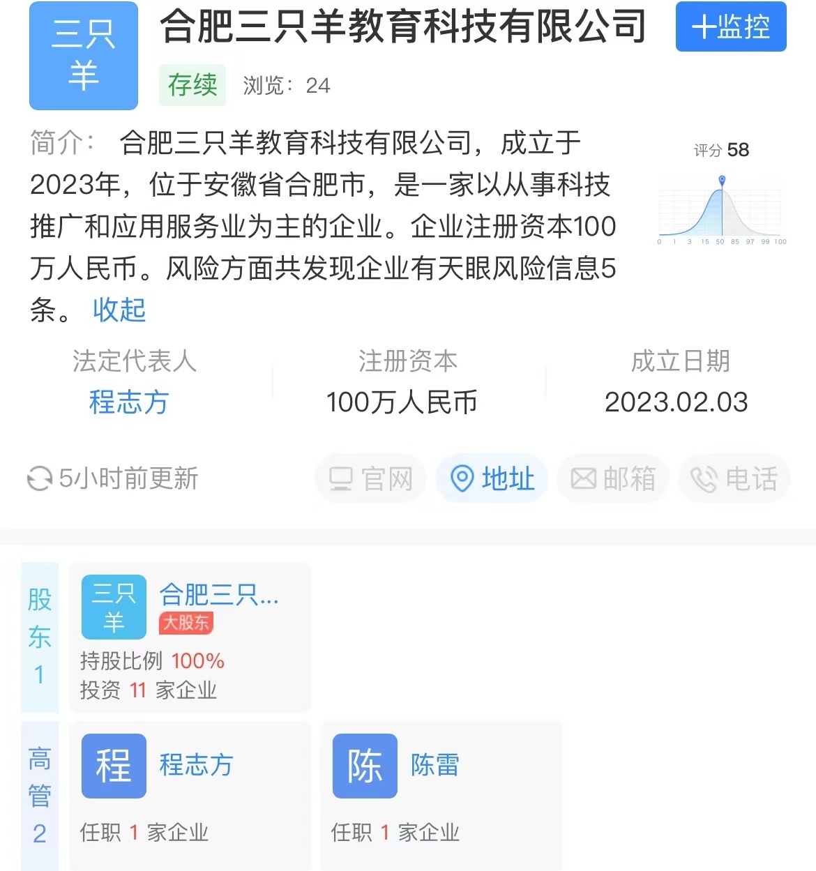 此外,天眼查资料显示,2月3日,合肥三只羊教育科技有限公司成立,法定代表人为程志方,注册资本100万人民币。