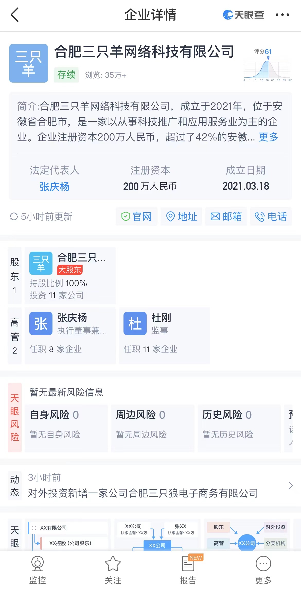 天眼查信息显示,合肥三只羊创业投资有限公司成立于2022年3月20日,注册资本3000万人民币,法定代表人为张庆杨。