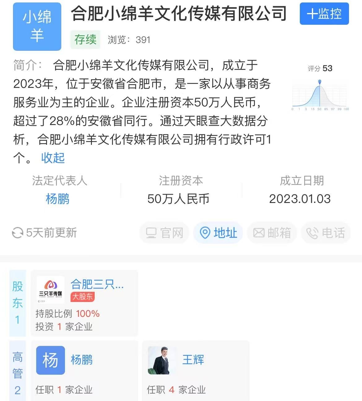 股东信息显示,该公司由“疯狂小杨哥”关联公司合肥三只羊文化传媒有限公司全资持股。