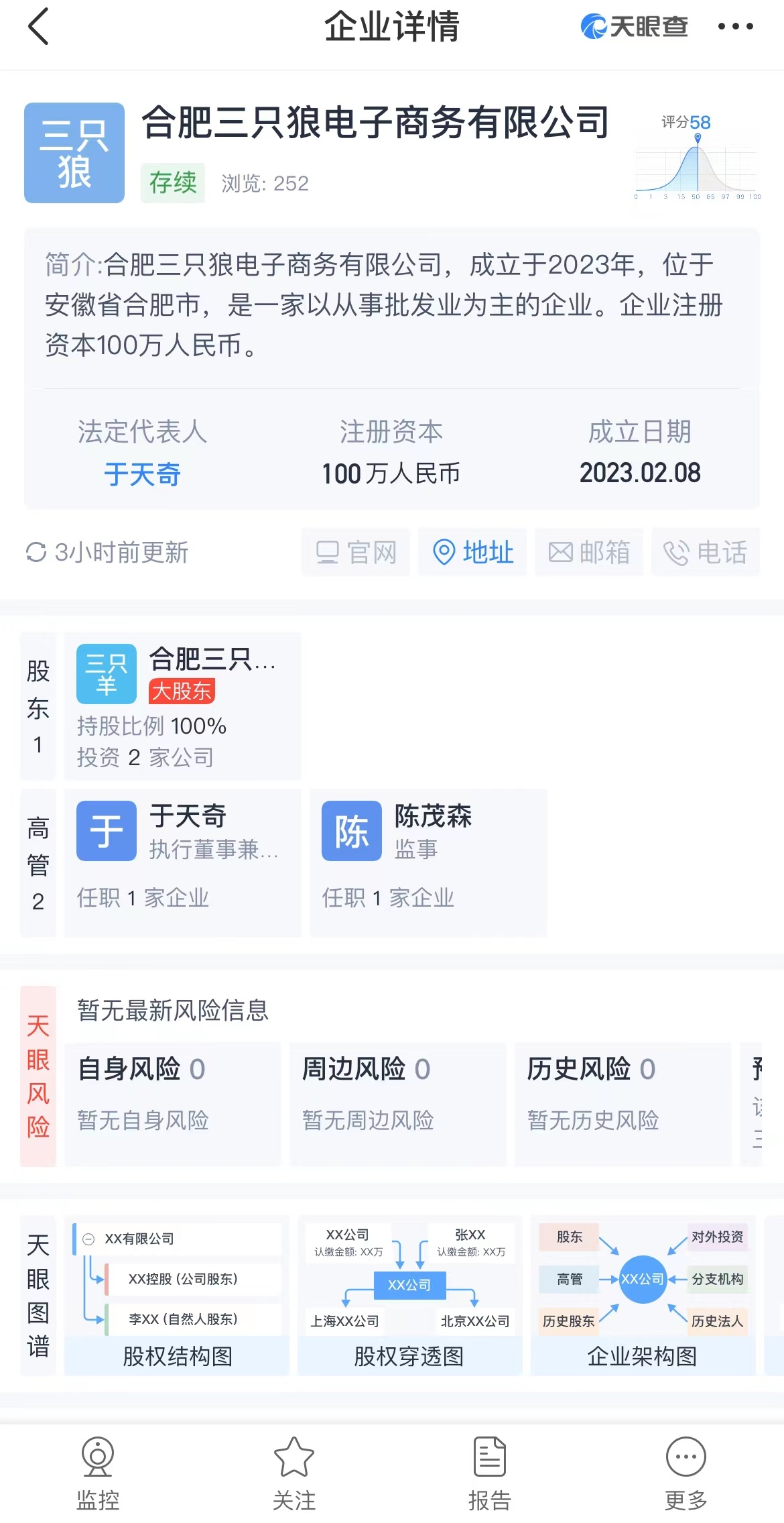 2月13日消息,天眼查资料显示,近日,合肥三只狼电子商务有限公司成立,注册资本100万人民币,法定代表人为于天奇,经营范围含互联网销售(除销售需要许可的商品);网络设备销售;个人互联网直播服务;组织文化艺术交流活动;文化娱乐经纪人服务;租赁服务(不含许可类租赁服务);普通货物仓储服务(不含危险化学品等需许可审批的项目)等。