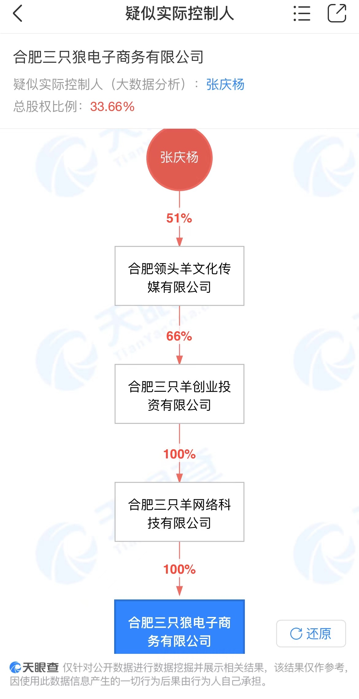 股权穿透图显示,该公司由合肥三只羊网络科技有限公司全资持股,疯狂小杨哥张庆杨为疑似实际控制人。