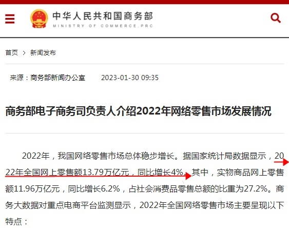 上个月,商务部电子商务司负责人介绍2022年网络零售市场发展情况。国家统计局数据显示,2022年全国网上零售额13.79万亿元,同比增长4%。其中,实物商品网上零售额11.96万亿元,同比增长6.2%,占社会消费品零售总额的比重为27.2%。