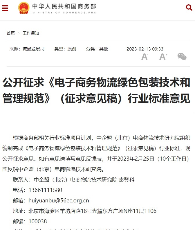 值得一提的是,根据商务部相关行业标准项目计划,中企盟(北京)电商物流技术研究院组织编制完成《电子商务物流绿色包装技术和管理规范》(征求意见稿)行业标准,今日公开征求意见。