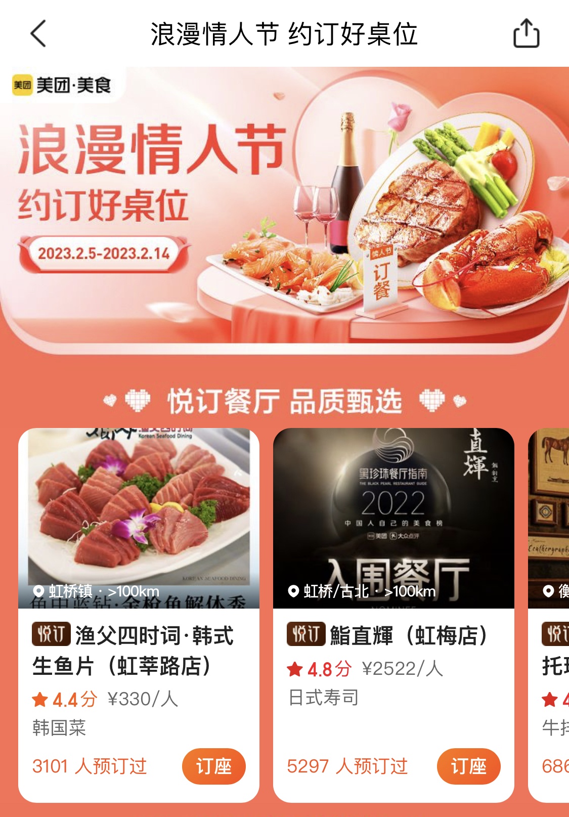 2月5日起,大众点评美食频道的订座专区上线了“约订好位置”主题活动,为提供订座功能的餐厅提供专属流量支持。以杭州为例,在多个线上订座活动带动下,大众点评必吃榜的mamala西餐厅内,30多桌的情人节座位基本在节日20天前就已全部订满。