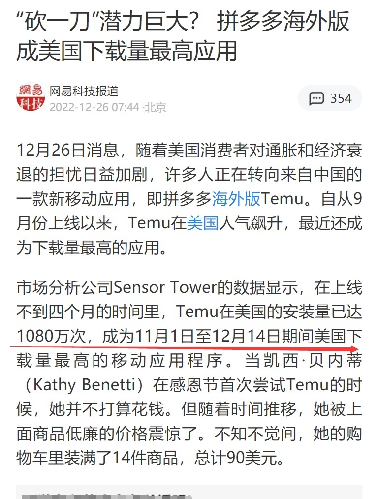 另外,Sensor Tower数据显示,在上线不到四个月的时间里,TEMU在美国的安装量已达1080万次,成为11月1日至12月14日期间美国下载量最高的移动应用程序。