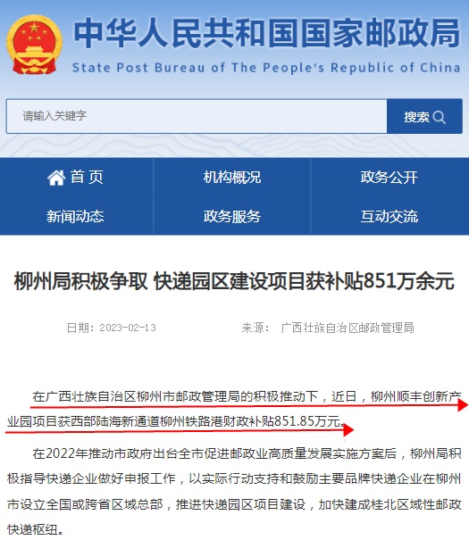 2月13日消息,在广西壮族自治区柳州市邮政管理局的积极推动下,近日,柳州顺丰创新产业园项目获西部陆海新通道柳州铁路港财政补贴851.85万元。