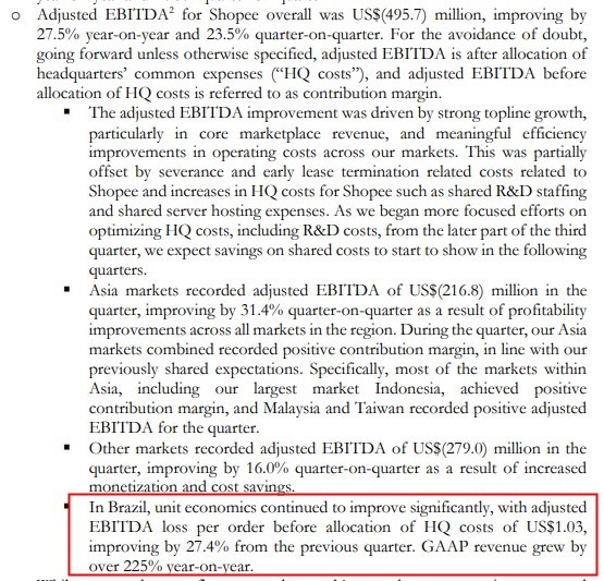 根据Sea此前公布的2022年第三季度财报,Shopee整体调整后EBITDA为4.957亿美元,同比增长27.5%,环比增长23.5%。在巴西,调整后EBITDA每订单损失1.03美元,比上一季度提高27.4%;GAAP收入同比增长超过225%。该公司计划在2023年底前实现Shopee整体调整后的EBITDA盈亏平衡。