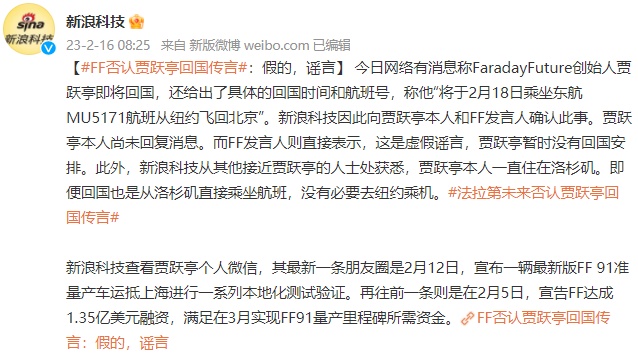 法拉第未来否认贾跃亭回国传言 谣言
