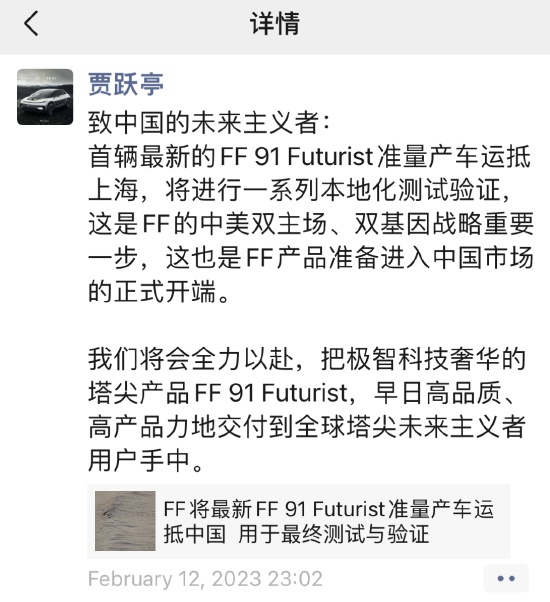 此外,据新浪科技查看贾跃亭个人微信,其最新一条朋友圈是2月12日,宣布一辆最新版FF91准量产车运抵上海进行一系列本地化测试验证。前一条则是在2月5日,宣告FF达成1.35亿美元融资,满足在3月实现FF91量产里程碑所需资金。